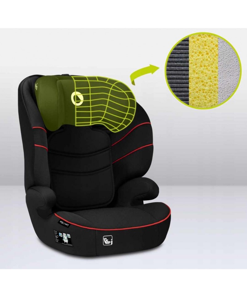 Zagłówek został wzmocniony pianką Memory Foam, która, dzięki dużej sprężystości, pochłania przeciążenia, dodatkowo chroniąc głowę oraz odcinek szyjny dziecka.