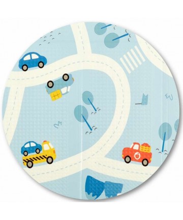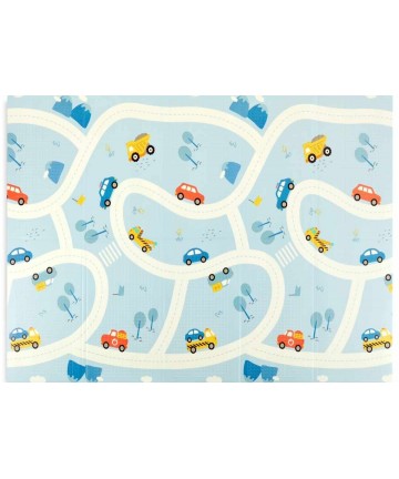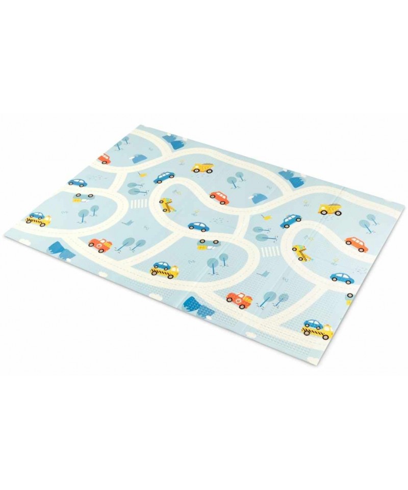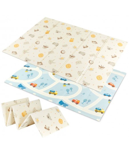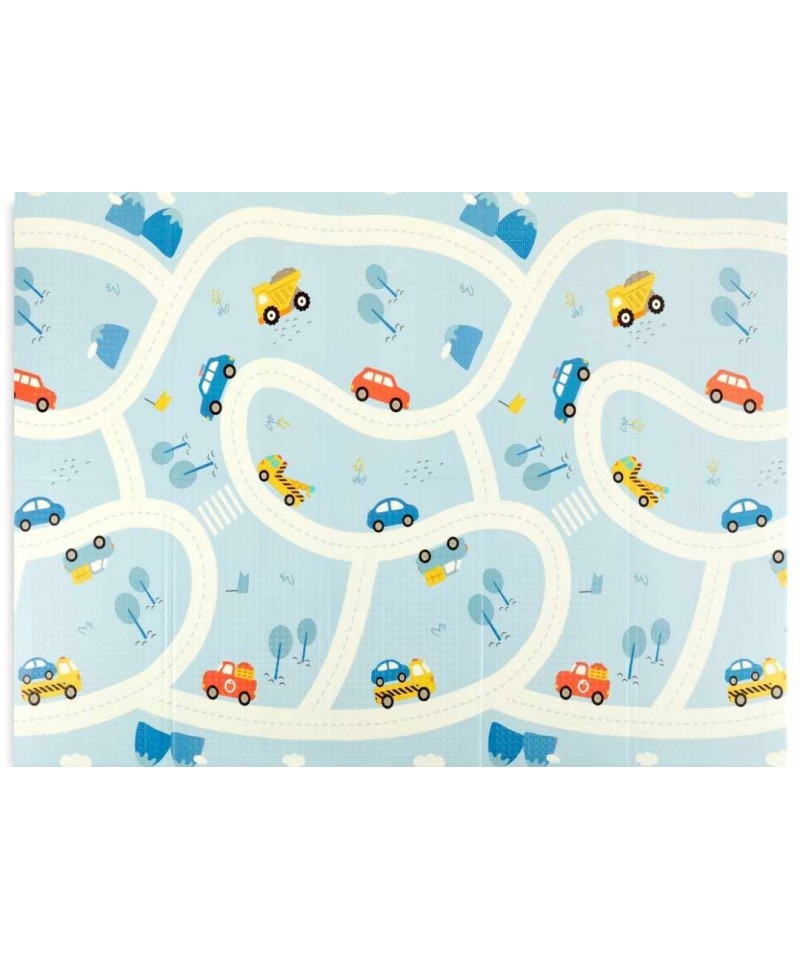 Druga strona maty prezentuje ciekawy świat z kolorową trasą. Na powierzchni maty widoczne są urocze postacie zwierząt, kolorowe diabelskie młyny oraz urokliwe domki z owoców, tworząc przyjazne i animowane otoczenie dla maluchów.