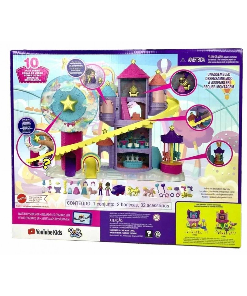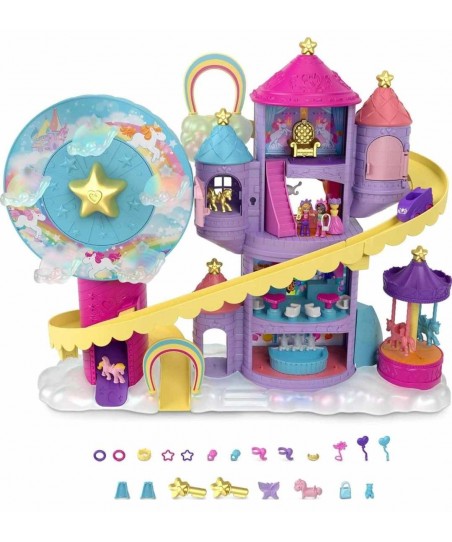Przygotuj się na cały dzień w wesołym miasteczku Polly Pocket™! Zestaw do zabawy Tęczowy park rozrywki ma aż 3 atrakcje, 7 obszarów do zabawy, mikrolalki Polly™ i Shani™, 2 jednorożce i 25 niespodzianek (łącznie 30 elementów do zabawy).