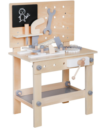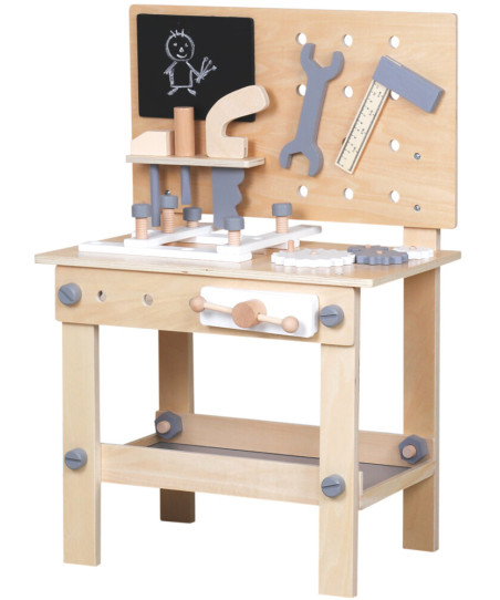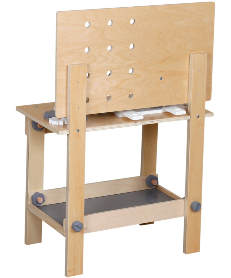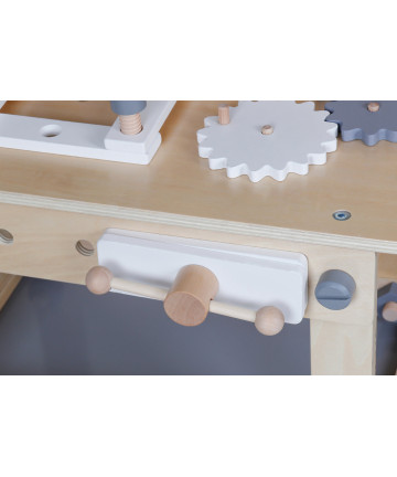 W skład tego zestawu wchodzi wiele elementów. Młodzi majsterkowicze, wykorzystując swój własny pomysł, mogą łączyć i przekształcać elementy, tworząc niekończącą się ilość konstrukcji. W zestawie znajdują sięsolidne, drewniane narzędza oraz śruby, nakrętki i płytki, które umożliwiają maluchom naśladowanie prawdziwych czynności, takich jak skręcanie, mierzenie czy cięcie. Wszystko to doskonale stymuluje rozwój zdolności manualnych, ucząc jednocześnie precyzji i cierpliwości.
