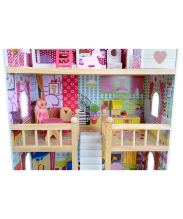 Mocnadrewniana konstrukcja pozwoli długo cieszyć się zabawą. Pięknytrzypiętrowy, drewniany domek dla lalek z tarasem jest w pełni wyposażony. Posiada pięć dużych pomieszczeń, które dziecko może umeblować według własnej wyobraźni. W zestawie z naszym domkiem dodajemy 17 różnych mebelków i akcesoriów, dzięki czemu dziecko ma ogrom możliwości do aranżacji pomieszczeń. Wnętrza możemy rozjaśnić dołączonym oświetleniem LED, które posiada pilota do ustawienia jasności i koloru światła