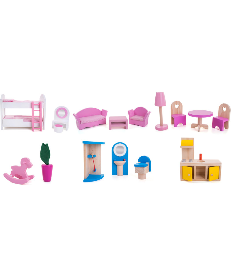 • W zestawie 17 różnorodnych mebelków i akcesoriów.
