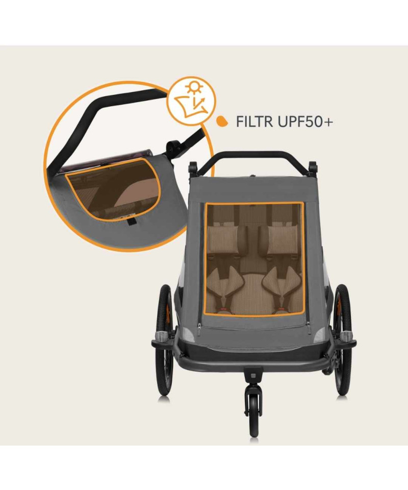 Tapicerka z filtrem UPF+ z systemem w technologii Dri-Seat skutecznie chroni przed słońcem oraz zapobiega poceniu się dziecka, będąc wewnątrz przyczepki. Materiał został również pokryty powłoką hydrofobową, która chroni przed zamoknięciem pojazdu. Natomiast okna i pokrycie przednie zostały wykonane z przyciemnianej folii, która ogranicza nagrzewanie się wnętrza. Podczas spacerów można również odpiąć przednią powłokę.