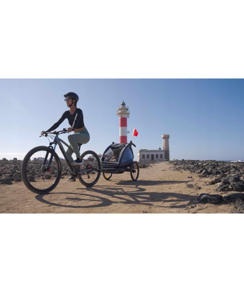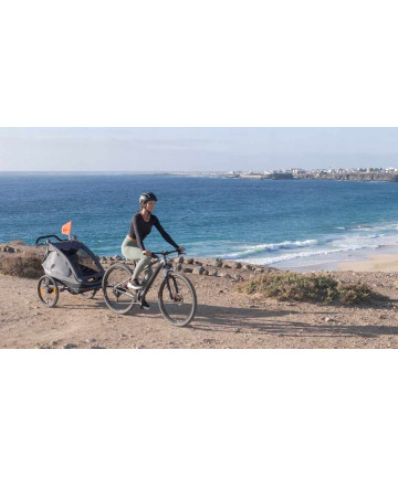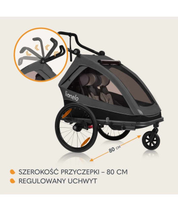 Optymalna szerokość przyczepki – 80 cm – sprawia, że podczas codziennych spacerów produkt z łatwością zmieści się w standardowych przejściach. O komfort podczas spacerów zadba regulowany uchwyt, a bagażnik o pojemności 60 l ułatwia transport najważniejszych rzeczy.