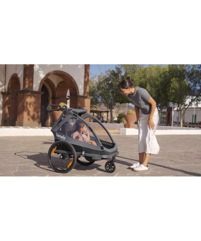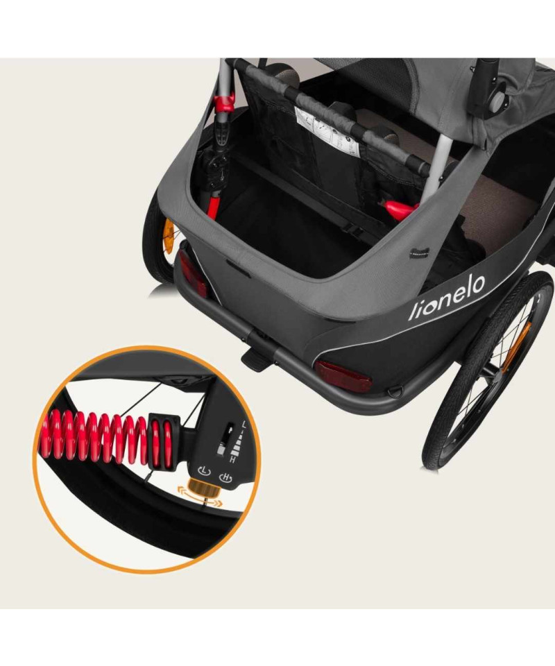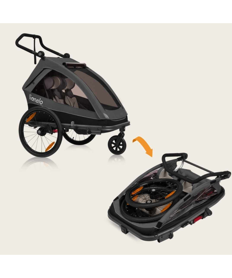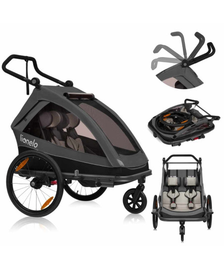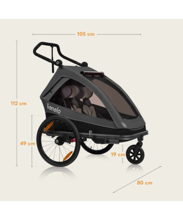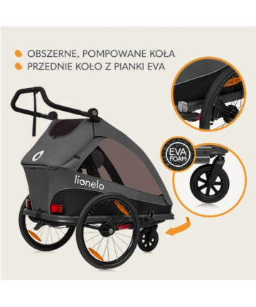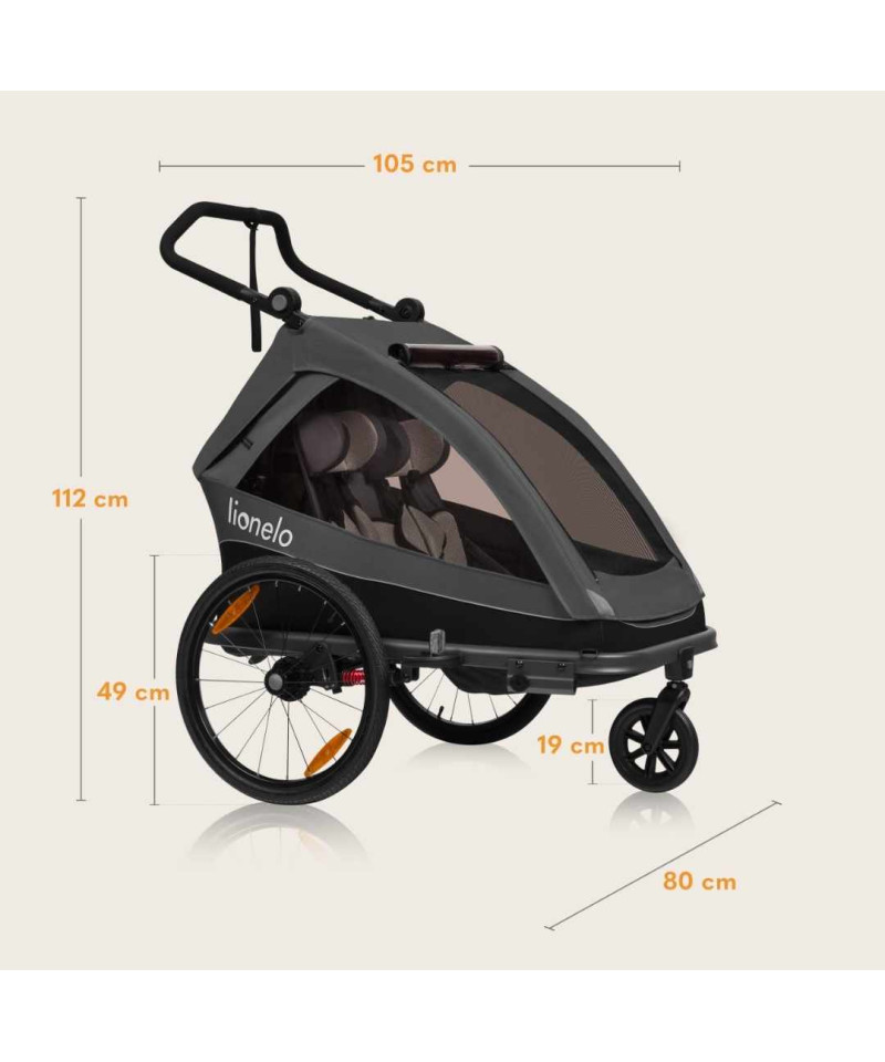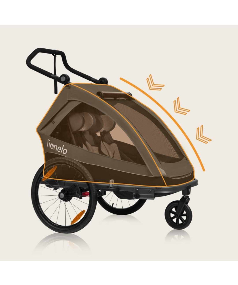 Dwuosobowa przyczepka do roweru oraz funkcja wózka spacerowego to produkt 2w1. Duże koła oraz system amortyzacji, zapewniają bezpieczną jazdę, na każdej możliwej nawierzchni lionelo Cama.