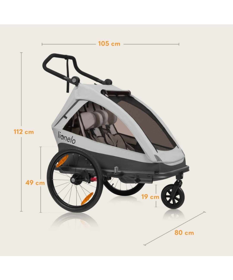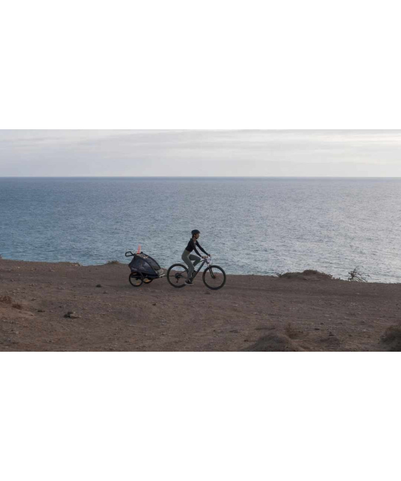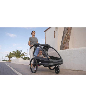 Optymalna szerokość przyczepki – 80 cm – sprawia, że podczas codziennych spacerów produkt z łatwością zmieści się w standardowych przejściach. O komfort podczas spacerów zadba regulowany uchwyt, a bagażnik o pojemności 60 l ułatwia transport najważniejszych rzeczy.