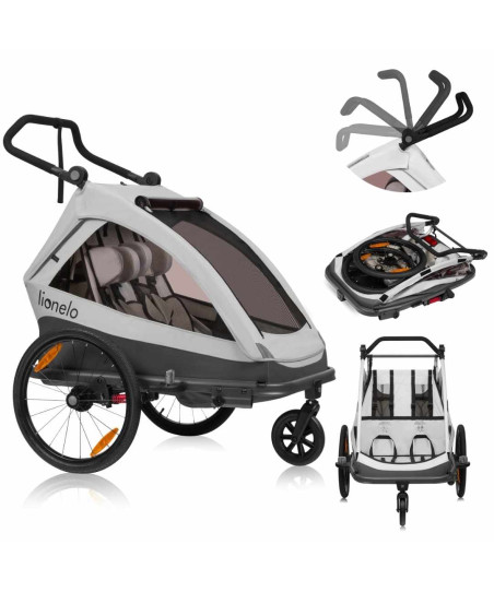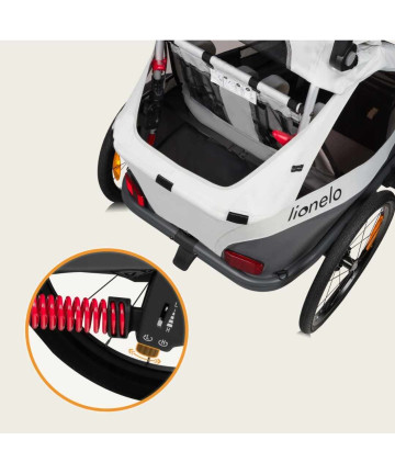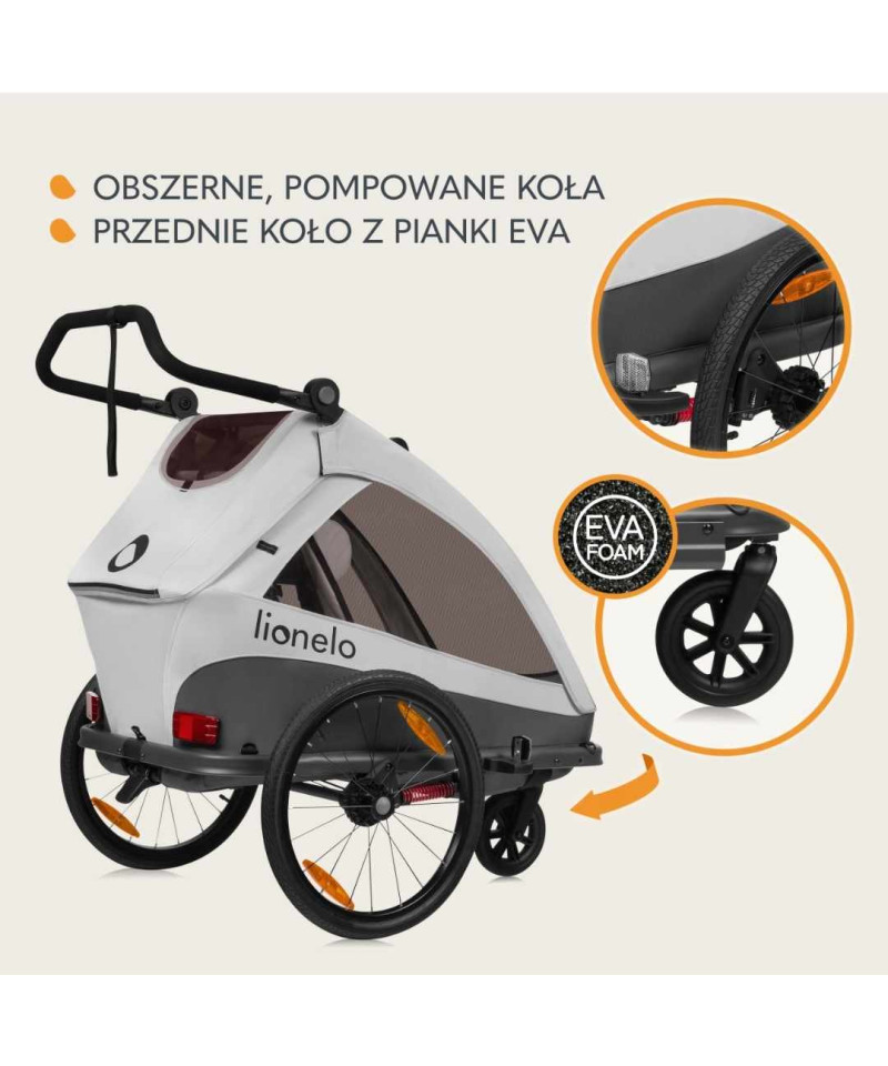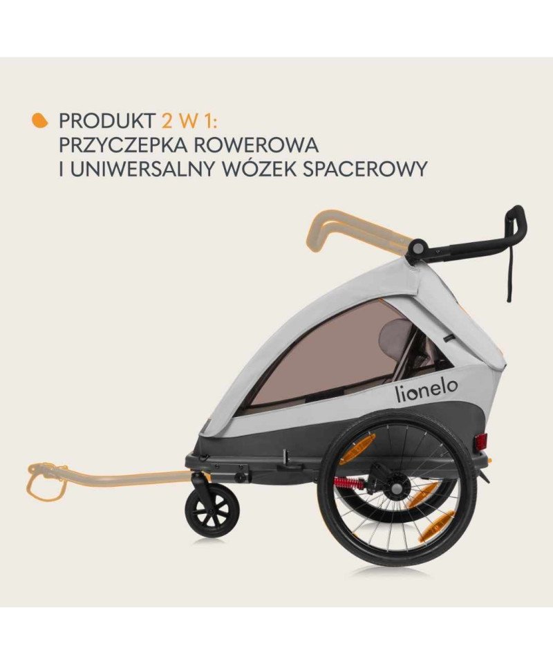 | Cechy dodatkowe | amortyzacja, chorągiewka bezpieczeństwa, funkcja jogger, hamulec, kieszenie, kółko spacerowe w zestawie, montowana do osi, moskitiera, odblaski, osłony przeciwsłoneczne, pasy pięciopunktowe, pompowane koła, przegrody, przestrzeń bagażowa, regulowane oparcie, regulowane rączki, składana konstrukcja przyczepki, zaczep do roweru |