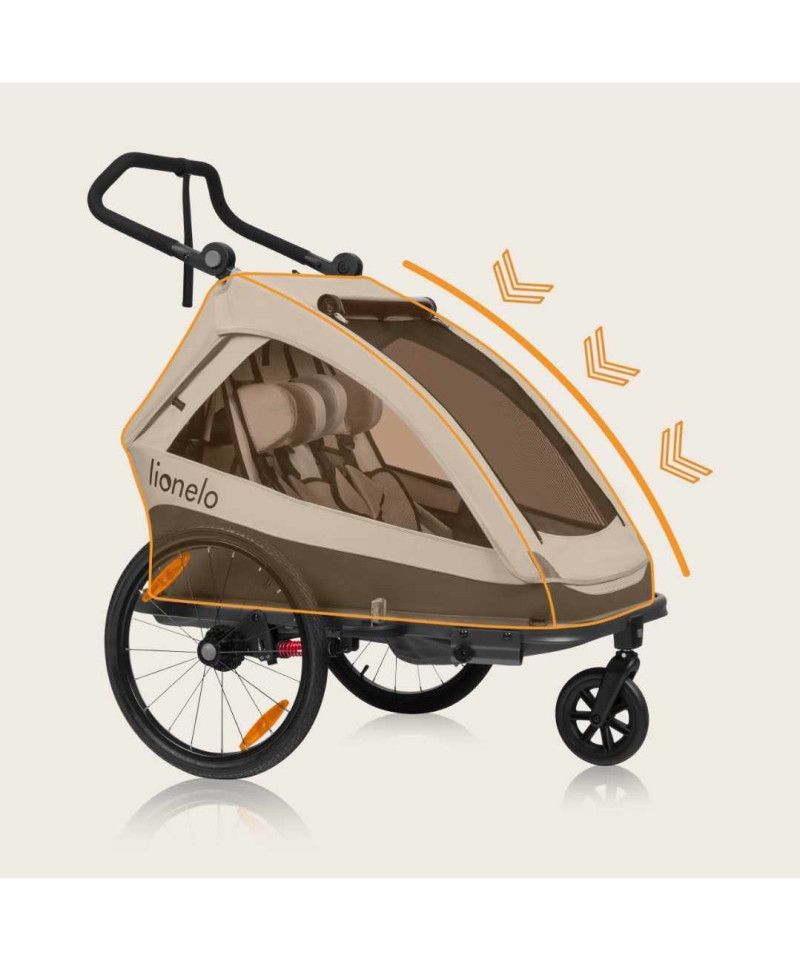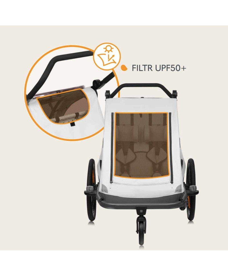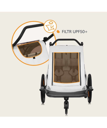 Tapicerka z filtrem UPF+ z systemem w technologii Dri-Seat skutecznie chroni przed słońcem oraz zapobiega poceniu się dziecka, będąc wewnątrz przyczepki. Materiał został również pokryty powłoką hydrofobową, która chroni przed zamoknięciem pojazdu. Natomiast okna i pokrycie przednie zostały wykonane z przyciemnianej folii, która ogranicza nagrzewanie się wnętrza. Podczas spacerów można również odpiąć przednią powłokę.
