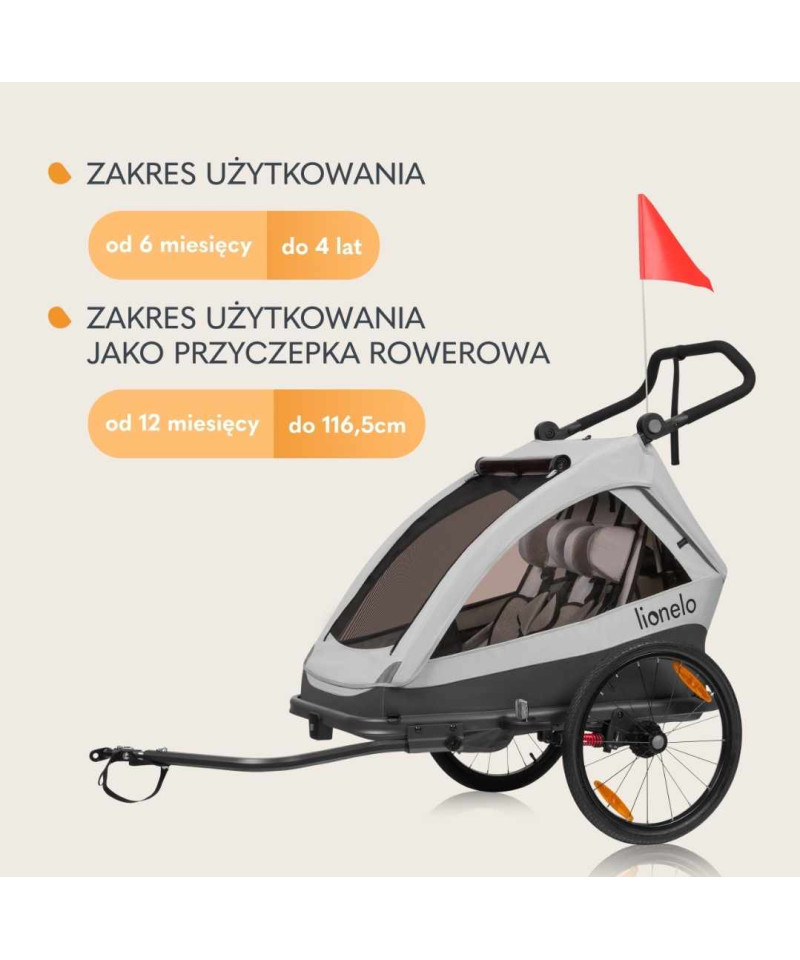Funkcja spacerówki pozwala na przewożenie dzieci już od 6 miesiąca życia, natomiast w przypadku jazdy rowerem – od 12 miesiąca. Produkt może być użytkowany aż do osiągnięcia 116,5 cm, co sprawia, że wystarczy na wiele lat.