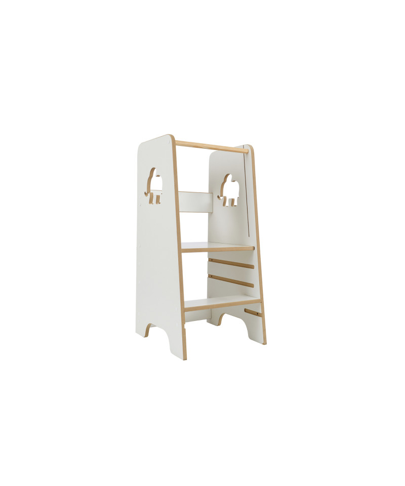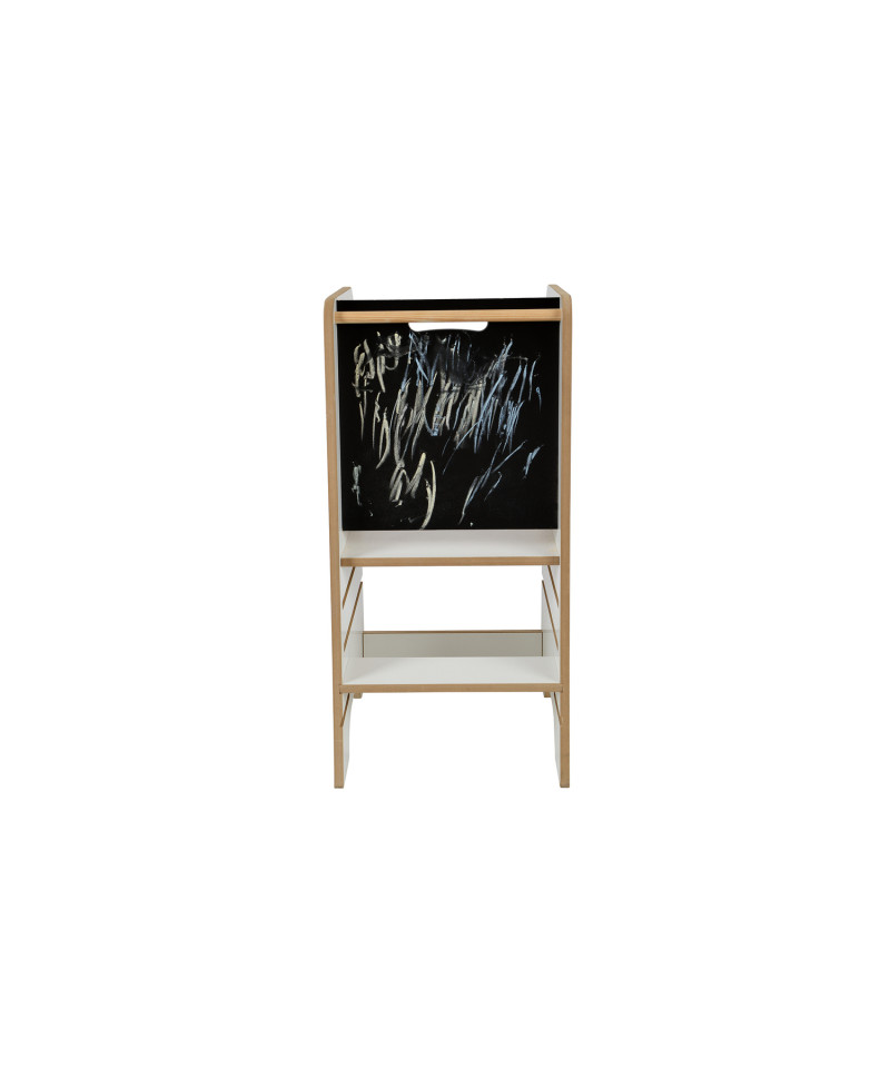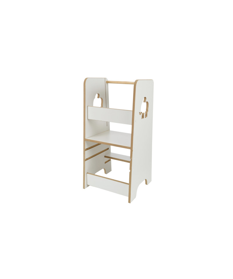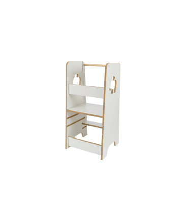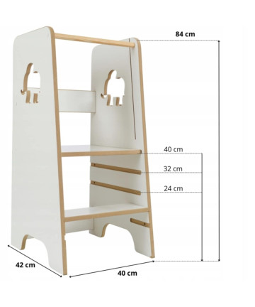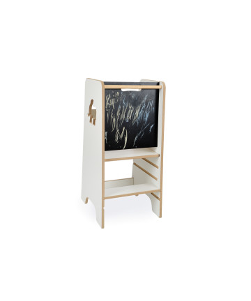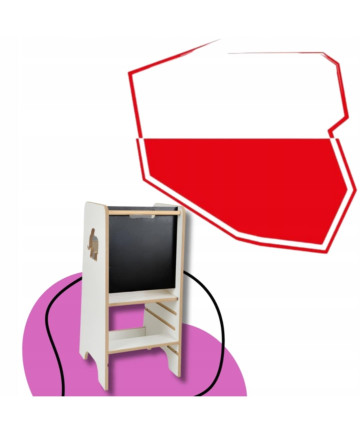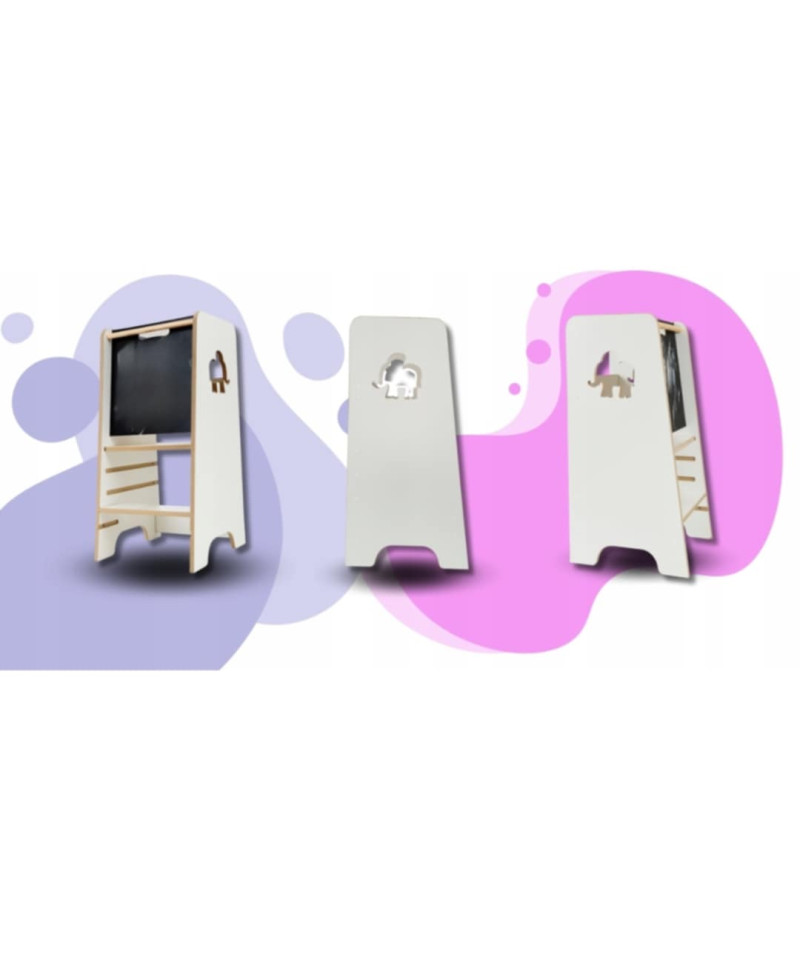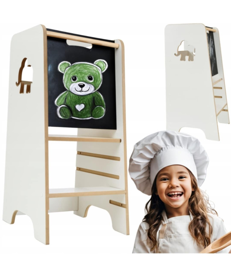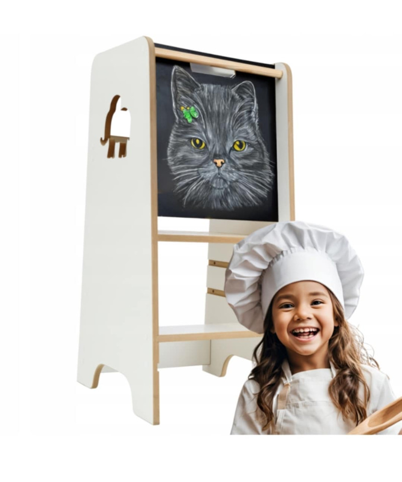 Dodatkowym atutem jest wbudowana tablica do rysowania, która rozwija kreatywność malucha i sprawia, że pomocnik może pełnić również funkcję edukacyjną. Solidne materiały, takie jak drewno i płyta MDF, gwarantują trwałość i odporność na uszkodzenia. Nowoczesny, minimalistyczny design sprawia, że pasuje do każdej kuchni.