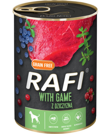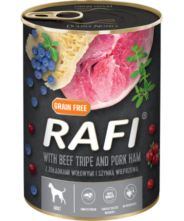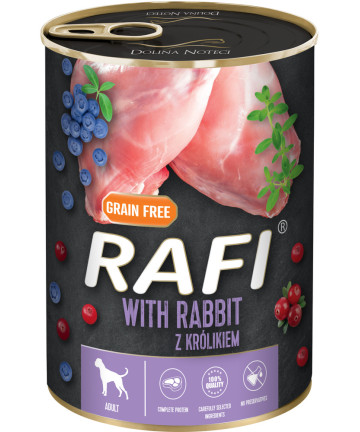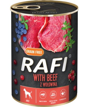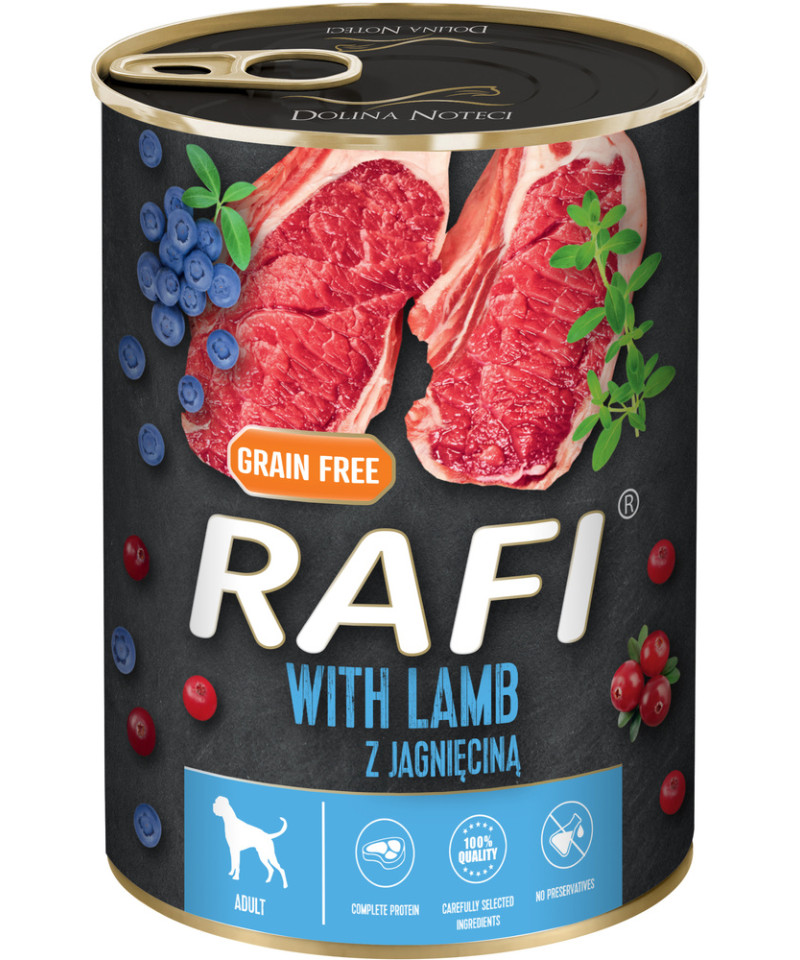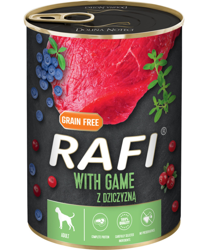 Linia RAFI to pełnoporcjowe karmy pokrywające w 100% dzienne zapotrzebowanie na wszystkie składniki odżywcze, mineralne i witaminowe. Ta mokra karma została zbilansowana pod kątem zawartości składników odżywczych w oparciu o nowoczesne normy i zalecenia prawidłowego żywienia dorosłych psów. Cennymi dodatkami są borówka oraz żurawina, wykazujące silne właściwości przeciwutleniające i przeciwzapalne. Tymianek wpływa na poprawę funkcji trawiennych, a także podnosi walory smakowe karmy.