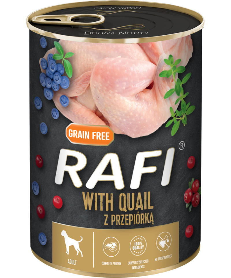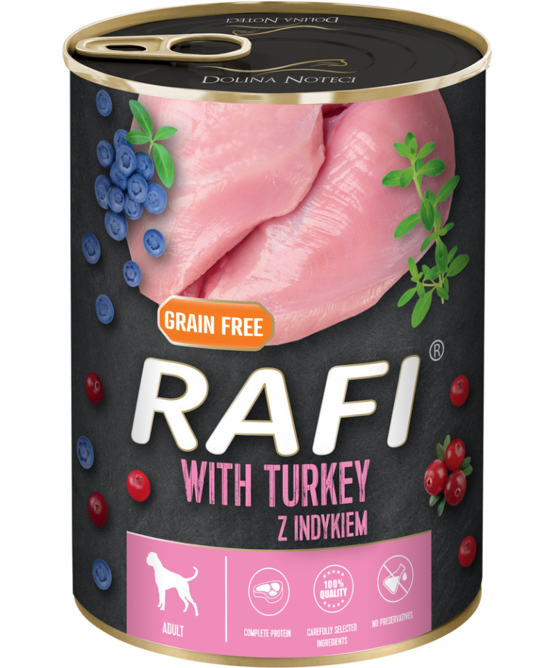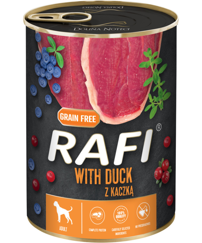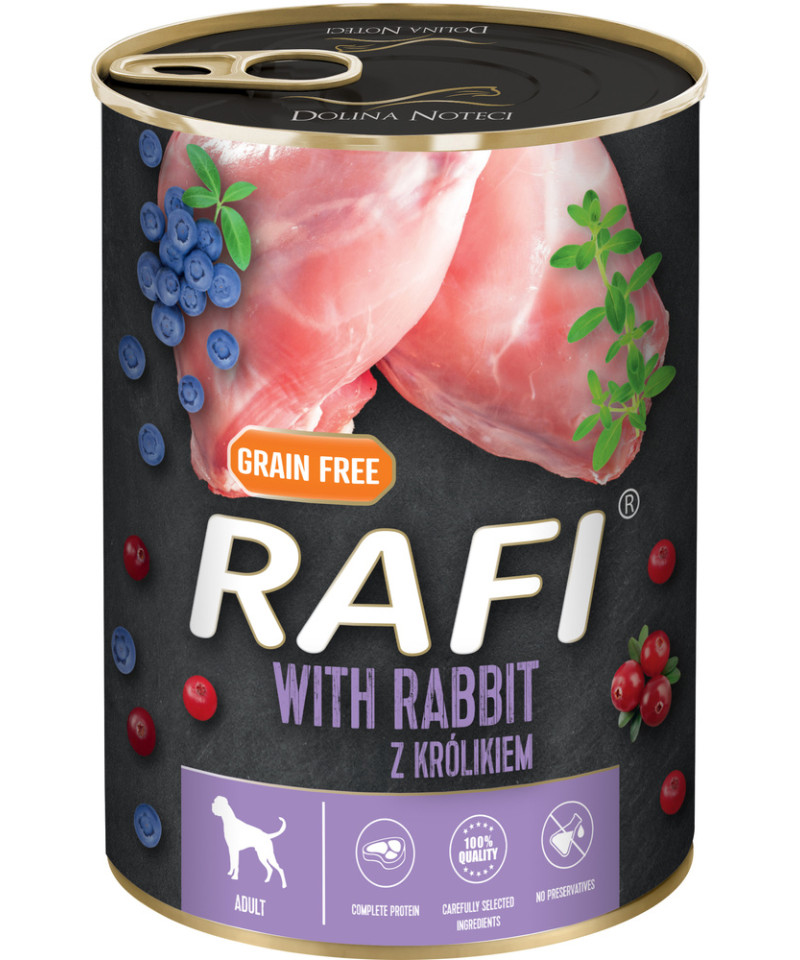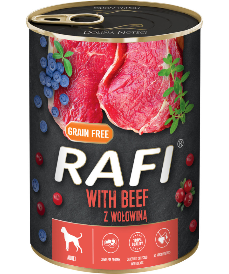 Linia RAFI to pełnoporcjowe karmy pokrywające w 100% dzienne zapotrzebowanie na wszystkie składniki odżywcze, mineralne i witaminowe. Ta mokra karma została zbilansowana pod kątem zawartości składników odżywczych w oparciu o nowoczesne normy i zalecenia prawidłowego żywienia dorosłych psów. Cennymi dodatkami są borówka oraz żurawina, wykazujące silne właściwości przeciwutleniające i przeciwzapalne. Tymianek wpływa na poprawę funkcji trawiennych, a także podnosi walory smakowe karmy.