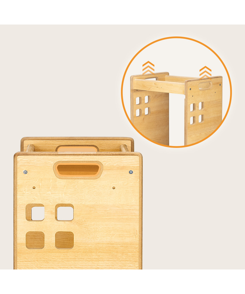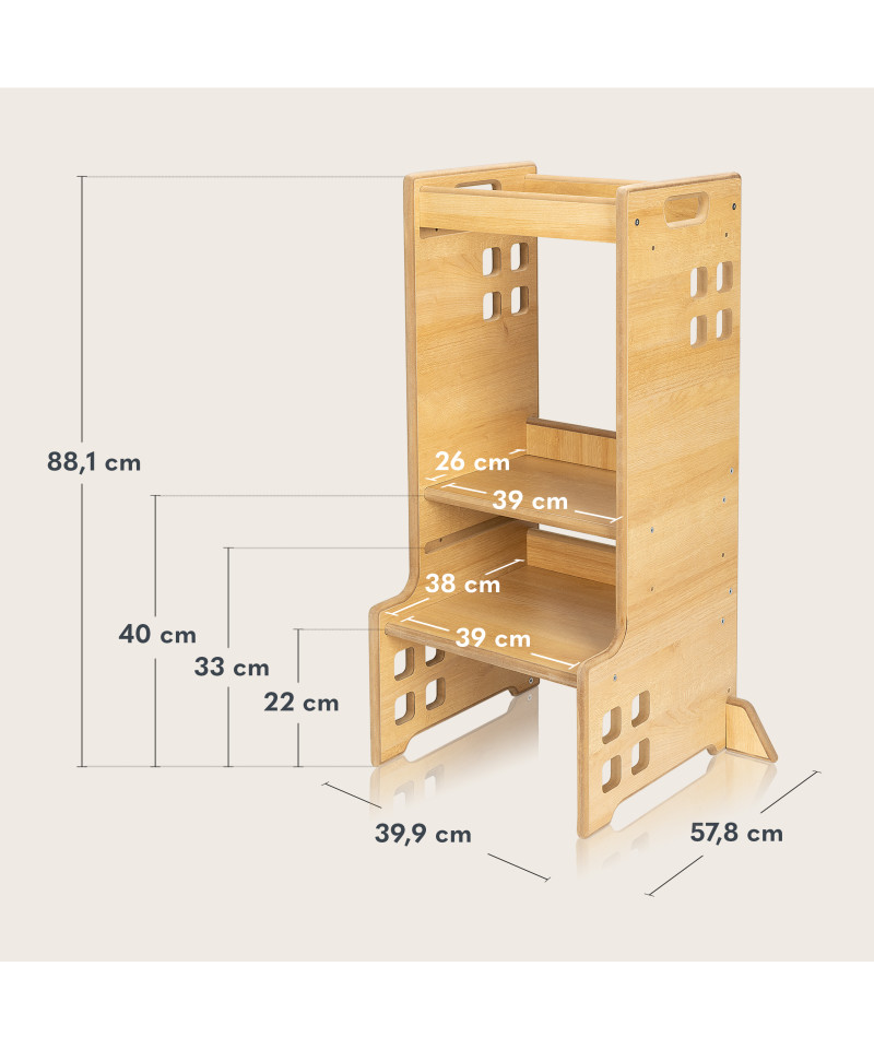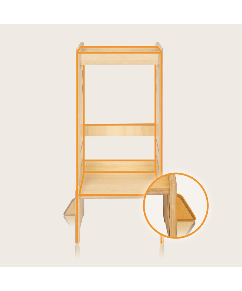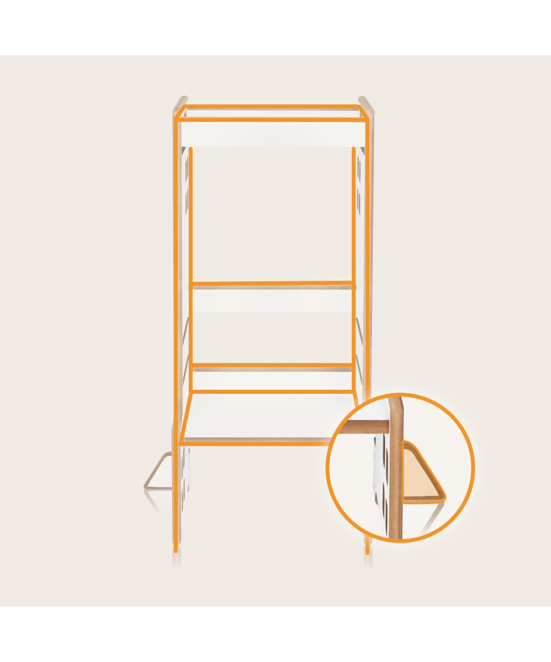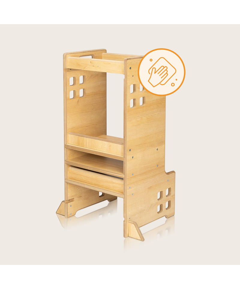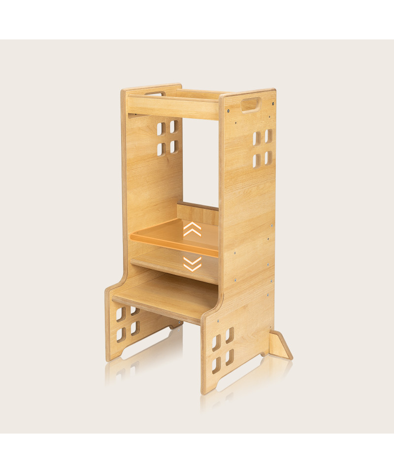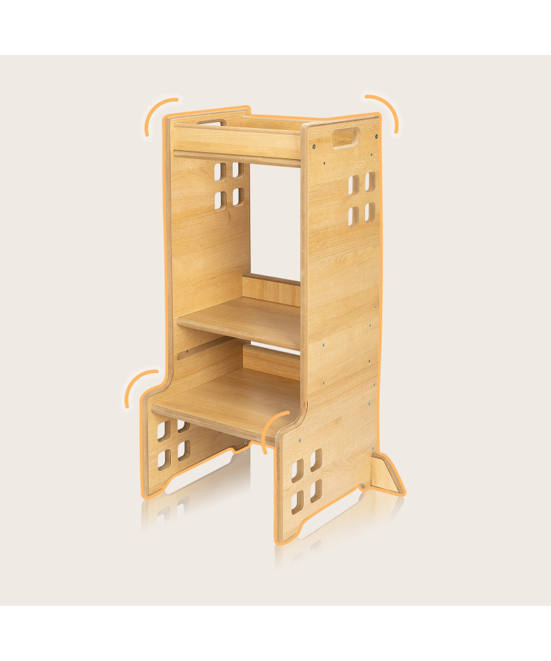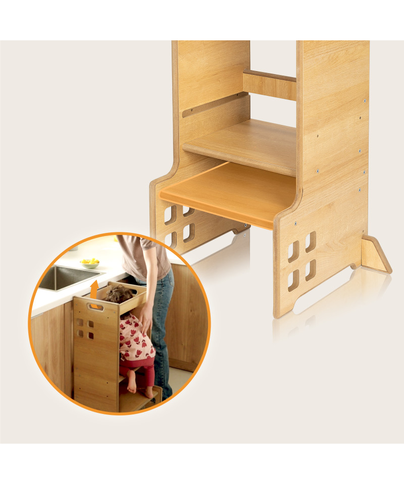 Zarówno jako pomocnik, jak i biblioteczka, zaprojektowany zgodnie z ideą Montessori mebel pozwala na umieszczanie przedmiotów czy książeczek na wysokości wzroku dziecka, co zachęca je do wyciągania rączek. Aktywizuje dziecko i stymuluje jego dalszy rozwój. W kuchni czy w dziecięcym pokoju, z dopasowanym do wzrostu meblem dziecko uczy się samodzielnego działania.