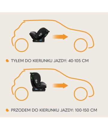 Ze względu na szeroki zakres wzrostowy fotelik umożliwia montaż zarówno przodem, jak i tyłem do kierunku jazdy.