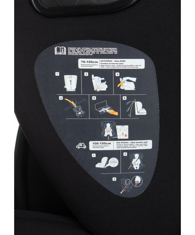 • i-Size (R129) - Spełnia najnowocześniejsze standardy bezpieczeństwa, obejmujące rygorystyczne testy, które gwarantują maksymalną ochronę dziecka podczas podróży.